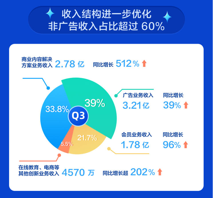 在第三季度,知乎月均视频内容上传量同比增长290%,日均视频上传量同比增长293%。用视频形式进行内容呈现的特征越发明显,用户对多元化形式展现的优质内容也更加青睐。该季度知乎月均视频创作者数量同比增长86%,截至9月30日,视频消费用户在知乎平均日活跃用户中渗透率进一步提升至37%。