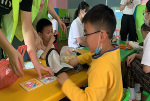 下午两点,星星屿桥团队从学校出发来到从化星语私教进行志愿活动,本次活动内容包括协助老师给自闭症儿童上课、陪孩子们面对面聊天和玩耍。康复中心的老师介绍到,他们课程科目有体育、思维能力、音乐、语言等,教学中以康复干预治疗为主,越早干预越能有效改善自闭状况。在第一节课的时候,队员们和小朋友们一起玩拼图,做游戏,观察每个孩子的心理情况并给予关照。在上一对一和团体课时,队员们认识到了一位说话困难的小孩,据老师介绍了解,这个孩子的父母都很忙,中午送饭都是保姆送,性格很怕生,不爱说话往往沉浸在自己的世界里,刚来到的时候爸爸妈妈都不会叫,偶尔叫出来的爸爸妈妈都是无意识的状态下叫出来的。他的学习能力较差,训练时需要手动的去矫正枫枫说话的囗型或者用一根矫正棒抵住舌头来矫正。如果他做得好的话,老师就会掰一点手指饼干,给他吃当作奖励。