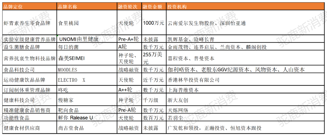 据驼鹿新消费整理的2022年1月至10月的食品饮料赛道的融资数据,70%的融资企业都有明确的健康定位,剩下的企业一般都为方便速食、调味品等企业,并不是代表“不健康”,只是在定位上没有像其他家一样明确表示出来。