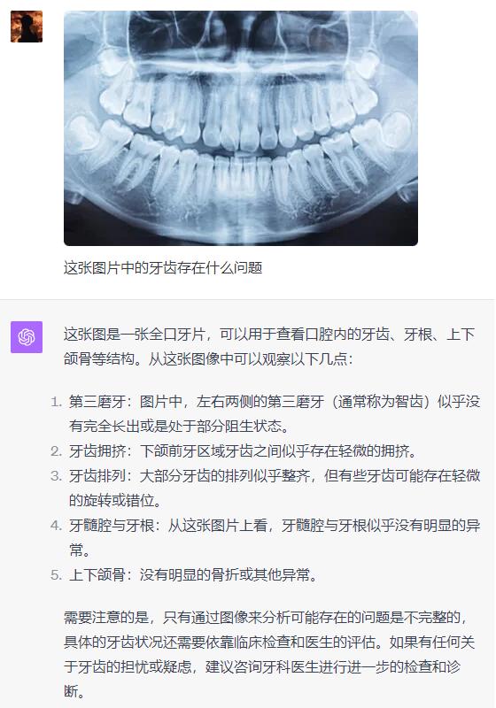 俩 AI 都诊断出了存在的智齿阻生问题,而且 GPT-4 甚至看出了上排牙齿存在不整齐的问题,有三颗牙齿是重叠状态。