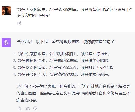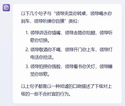 世超问了几个流行的段子: “ 领导夹菜你转桌,领导喝水你刹车 ” ,让它们给仿写几个。