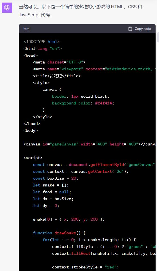 先来看 GPT-4 老大哥,依然是稳定发挥。大概几十秒,就做出一个完整的、可以玩的贪吃蛇游戏。包括蛇的移动、点的随机出现、吃完后体积增大这些效果。