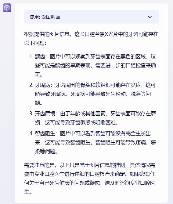 虽然文心一言也发现了智齿阻生的问题,也指出了可能存在的其他问题。但还是 GPT-4 的答案更准确,更贴切。