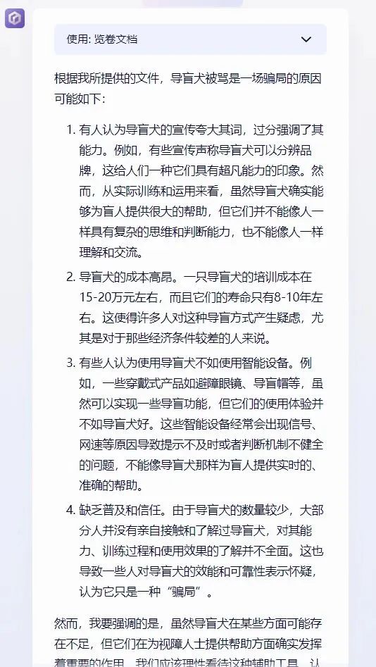 反倒是文心这一边理解的很准确,它回答的成本高、夸大宣传、不如导盲设备前景好等等,这些才是关键信息。