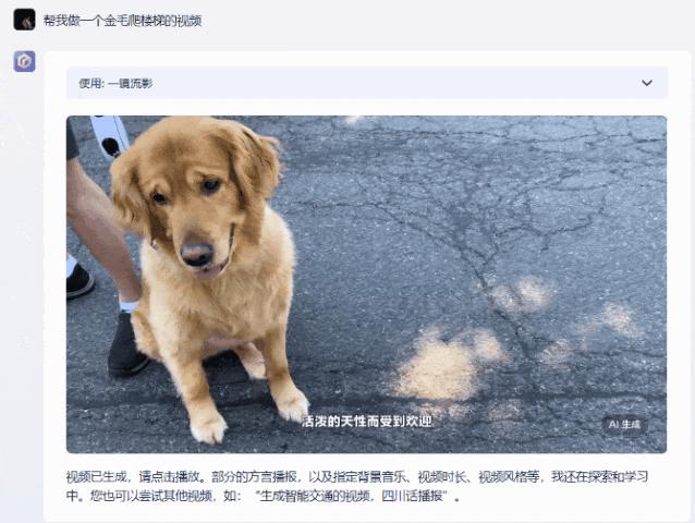 比如说一句话做一个金毛爬楼梯的视频,几分钟之后一条配好音的视频就做好了。