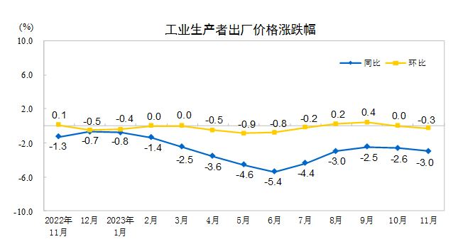 2023年11月份,全国工业生产者出厂价格同比下降3.0%,环比下降0.3%。与上月相比,11月的PPI同比和环比下降幅度略有增大。