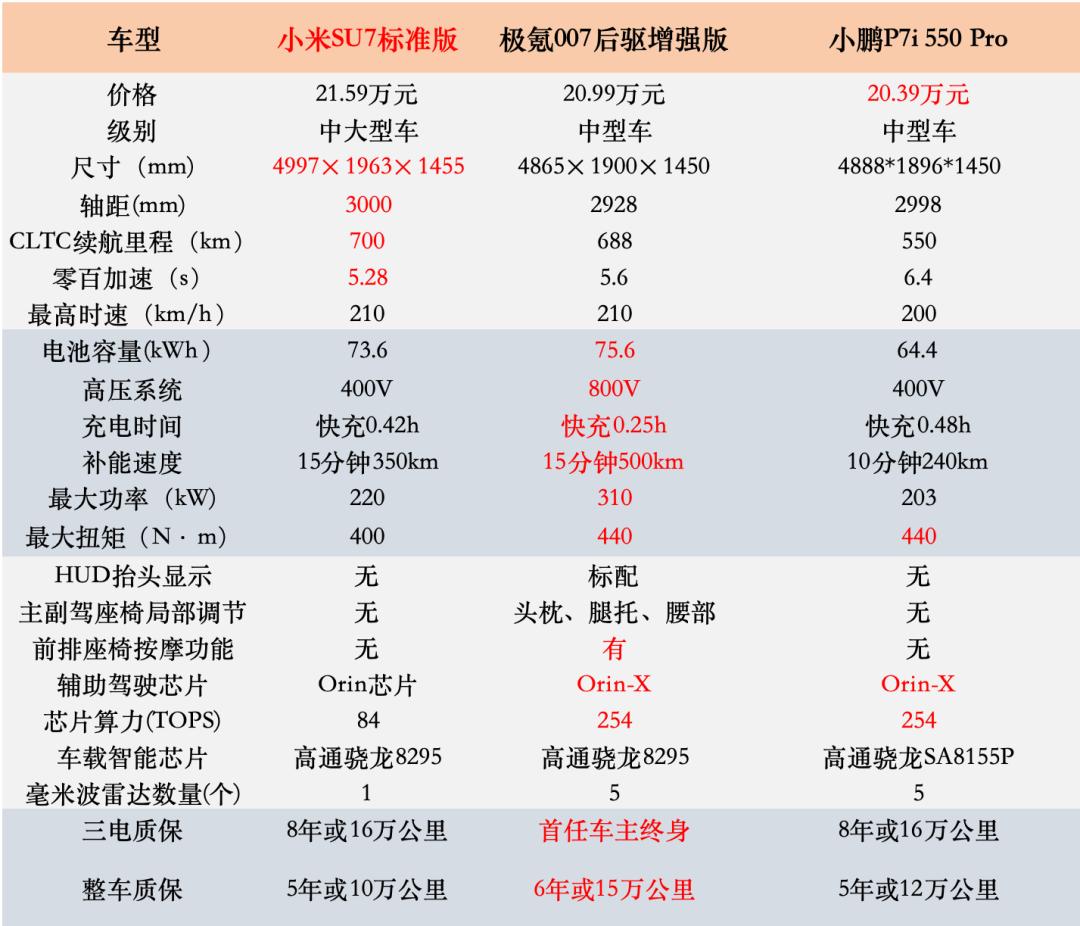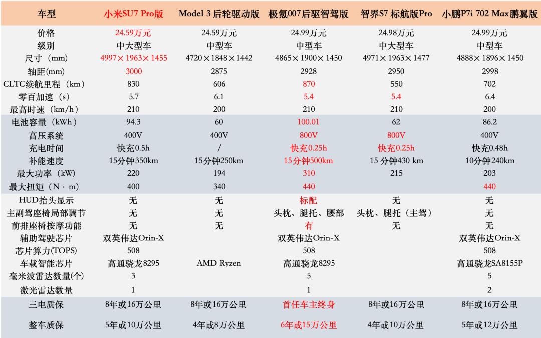 小米SU7的定价基本和Model 3(24.59万元起)、极氪007(20.99万元起)、极氪001(26.9万元起)、小鹏P7(20.39万元起)、智界S7(24.98万元起)等主流竞争对手的价格带重合。