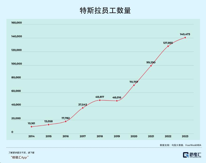 但随着全球工厂落地,业务布局相继清晰,克服产能地狱之后,特斯拉的员工人数在过去几年间仍然大幅增长,从2018年初的4.8万人增加到2024年初的14万人。