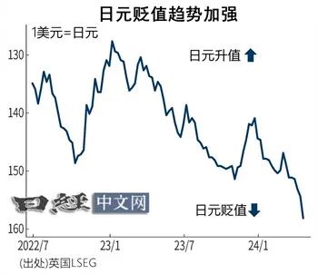 在4月29日的外汇市场上,日元兑美元的汇率下跌,一度跌到1美元=160日元,这是日元汇率自1990年4月以来,约34年来的最低水平。日本银行(央行)在4月26日结束的金融政策决定会议上决定维持现行的政策利率。在随后的记者会议上,日本银行总裁植田和男提及日元贬值时表示“对基础物价上涨率没有大的影响”。这使得人们认为,由于日元贬值而进行额外的利率上调的可能性很小,这也导致了日元贬值、美元升值。