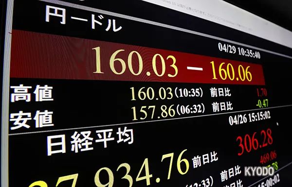 虽然4月29日是日本的节假日,但在海外市场,外汇交易仍然照常进行。在日本银行公布维持现行金融政策之前,日元在4月26日的汇率是155日元左右,经过日本银行的决定后,在26日的纽约市场,日元汇率下跌到了158日元。由于日元贬值的速度过快,人们对政府和日本银行可能会进行买入日元的外汇干预的警惕感也在增强。